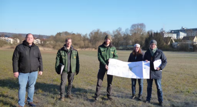Baubesprechung (von links): Thomas Sonntag (Amtsleiter Tiefbau und Umwelt), Oliver Grigoleit und Michael Pöhler von Pöhler Gut Reelsen und Katja Löwen sowie Thierry Brever vom Büro Gasse l Schumacher l Schramm Landschaftsarchitekten Partnerschaft Paderborn mbB, erörtern anhand des Plans, wo in diesem Bereich hinter dem Sulburgring ab Mai der Abenteuerspielplatz entstehen wird. Foto: Stadt Bad Driburg